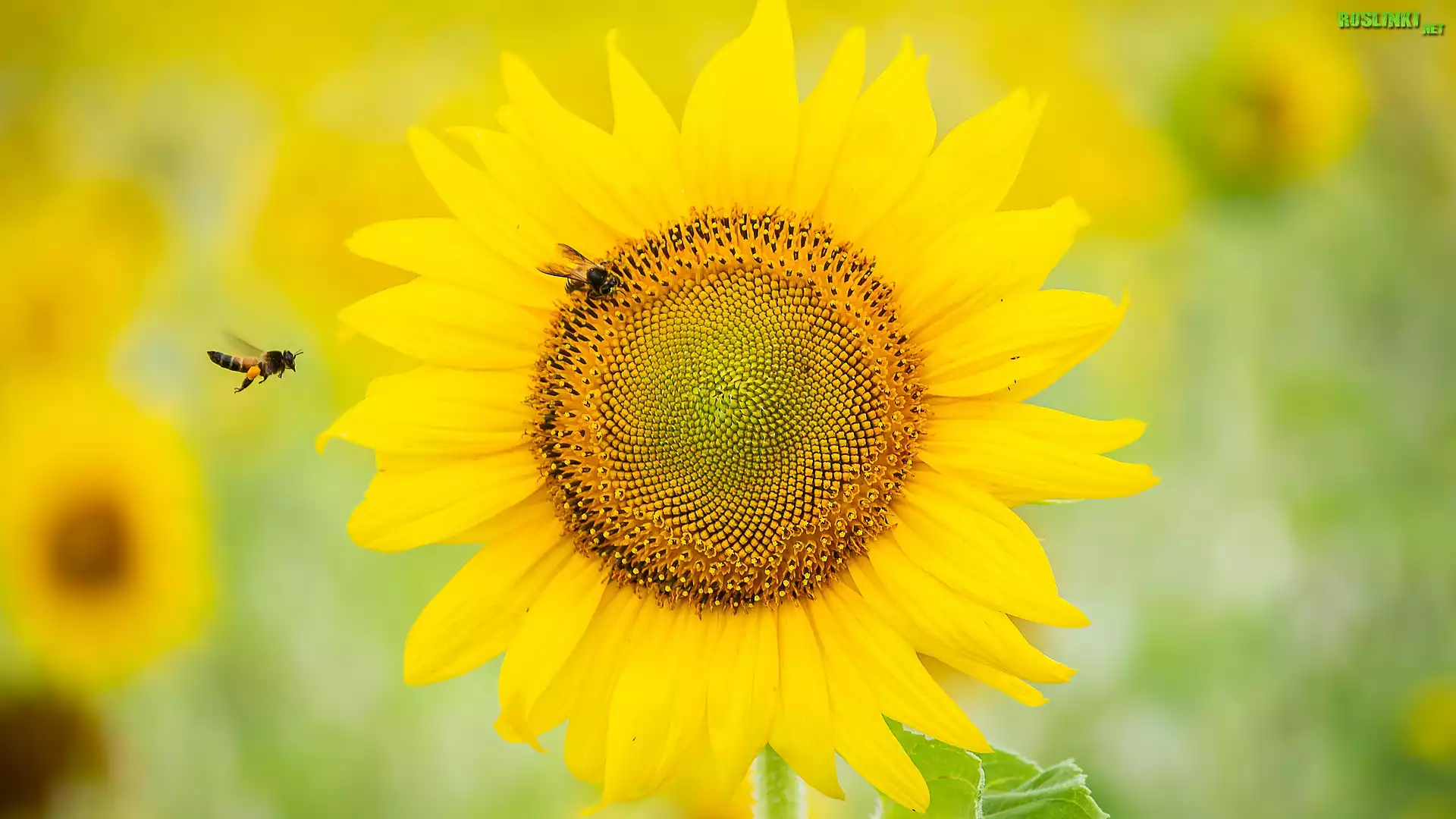 Kwitnący, Żółty, Słonecznik, Dwie, Pszczoły